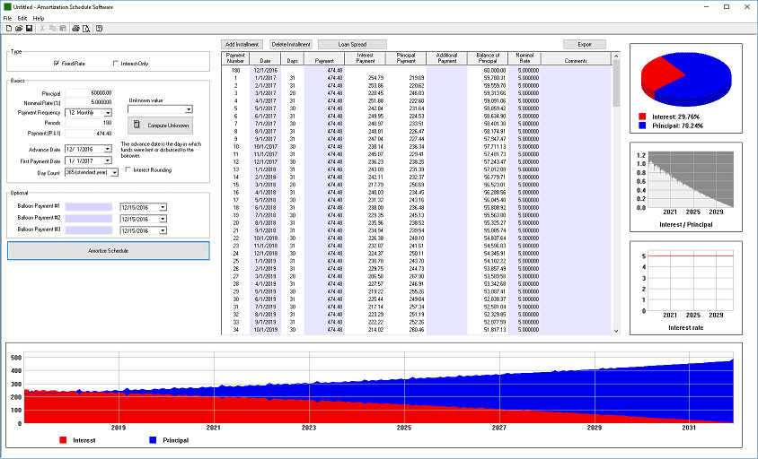 Our amortization calculator software makes it easy to generate detailed fixed-rate amortization schedules. You can customize schedules by adding, editing, or deleting installment payments. In addition, comments may be added to explain why certain variables changed. Users can also enter additional payments or fees, then view graphs and charts that clearly show the details of the repayment schedule. Results can be printed to paper or PDF, or exported directly into Excel for further analysis.