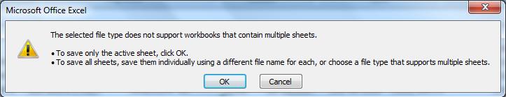 Select CSV (Comma delimited) and hit Save. This box will appear telling you essentially this just this sheet of the workbook will be saved: