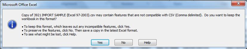 Click Ok. Another box will appear letting you know that save features are not compatible with CSV.